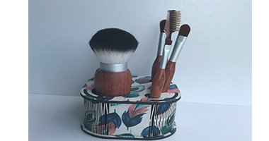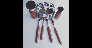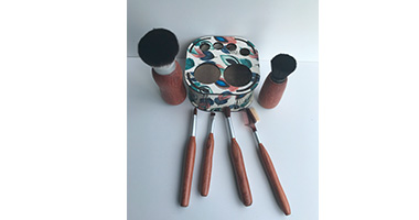 Each of these sets features 6 brushes. A large and smaller Kabuki brush for applying a wide range of makeup materials such as mineral powder, loose powder, bronzer, blush, etc. The larger brush is synthetic the smaller is made from goat hair. Both are designed to pick up more product and cover more area. Two types of brow brushes, an Angled Brow Brush for brow touch ups and a Double Ended Brow Brush for beautifying eyes and combing eyebrows. Also for the eyes a Eye Shaping Brush to help in applying colors from lash to brow and a Blender Brush for blending or to apply colors. All of this along with a convient stand.